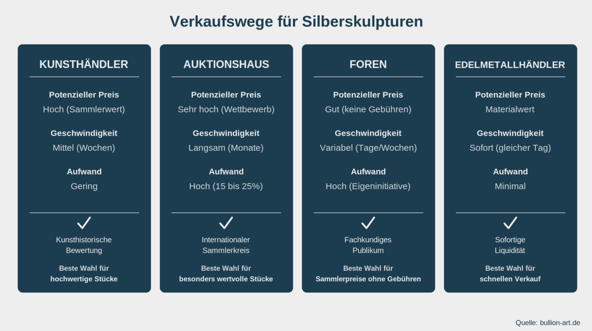 Für hochwertige Silberskulpturen mit Sammlerwert ist der spezialisierte Kunsthandel oft die beste Wahl. Erfahrene Händler erkennen den kunsthistorischen Wert Ihrer Skulptur und zahlen entsprechend mehr als den reinen Materialwert. Bei Einzelstücken renommierter Künstler oder antiken Objekten kann der Sammlerwert den Silberwert um ein Vielfaches übersteigen.