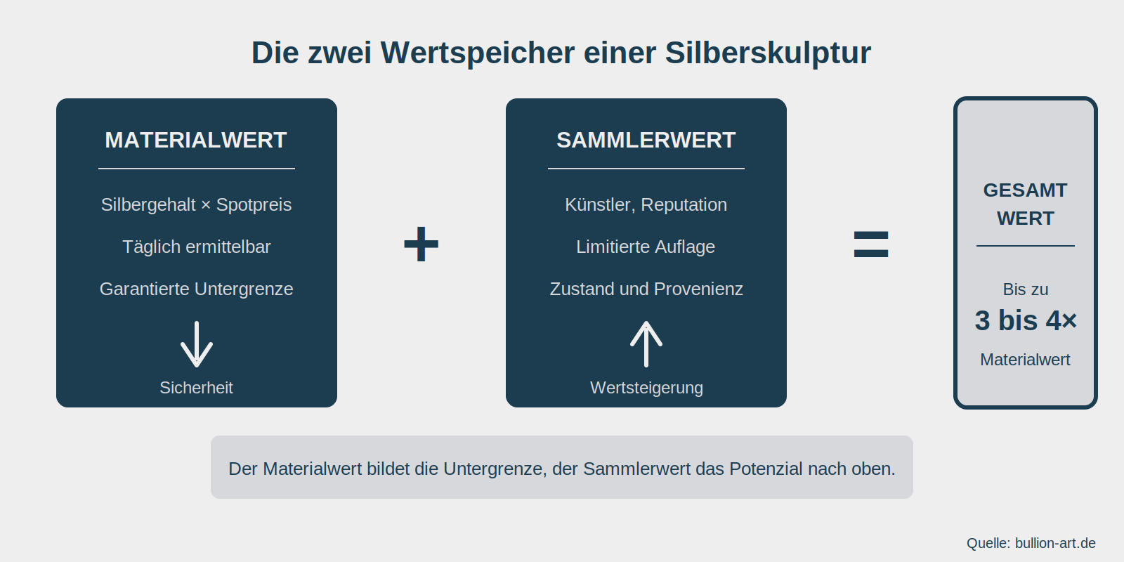 Ein Rechenbeispiel: Eine Skulptur aus 2 kg Feinsilber enthält rund 64 Feinunzen. 2016 lag der Silberpreis bei etwa 15 Euro pro Unze, der reine Materialwert betrug also rund 960 Euro. Heute, bei 75 Euro pro Unze, liegt der Materialwert derselben Skulptur bei etwa 4.800 Euro. Allein durch die Silberpreisentwicklung hat sich der Wert verfünffacht.